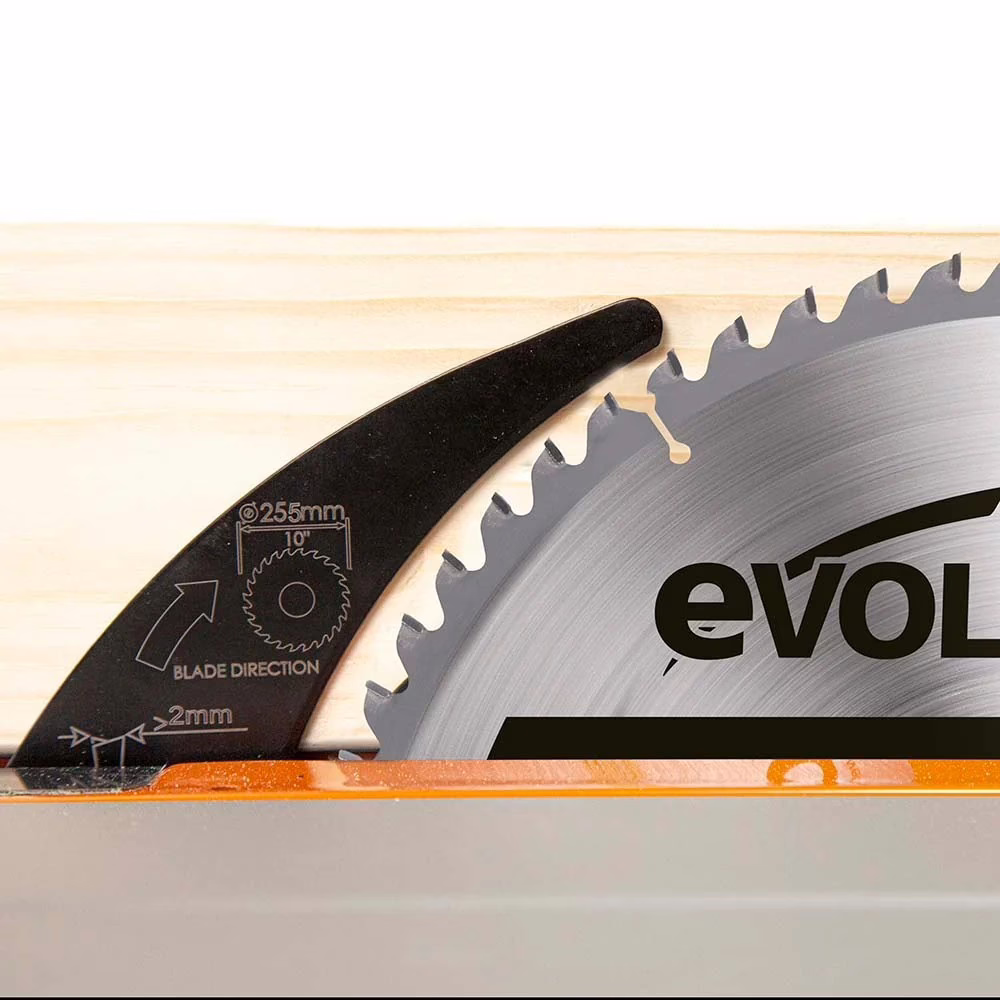 Разделителен нож за канални срезове, съвместим с напречна шейна е предназначен за преносимите настолни циркуляри от ново поколение Evolution R255TBL и R255TBL+.
